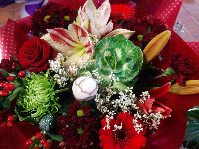 "All is bright" bouquet packed with mixed Christmastime flowers and foliages, including a velvety red rose, and amaryllis... a proper festive gift! Presented in our signature box- vase for ease of handling.